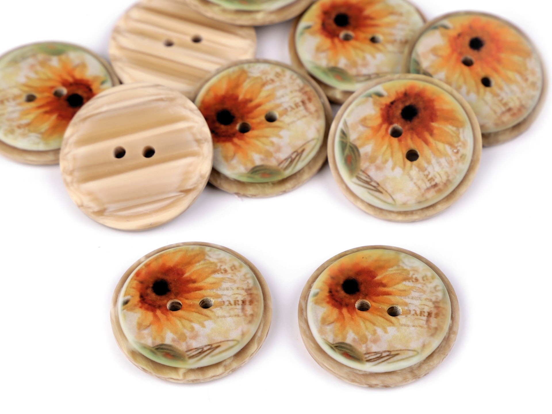 Knoflík Slunečnice - imitace dřeva 25mmSkladem8,0 Kč/ ks6,6 Kč bez DPH