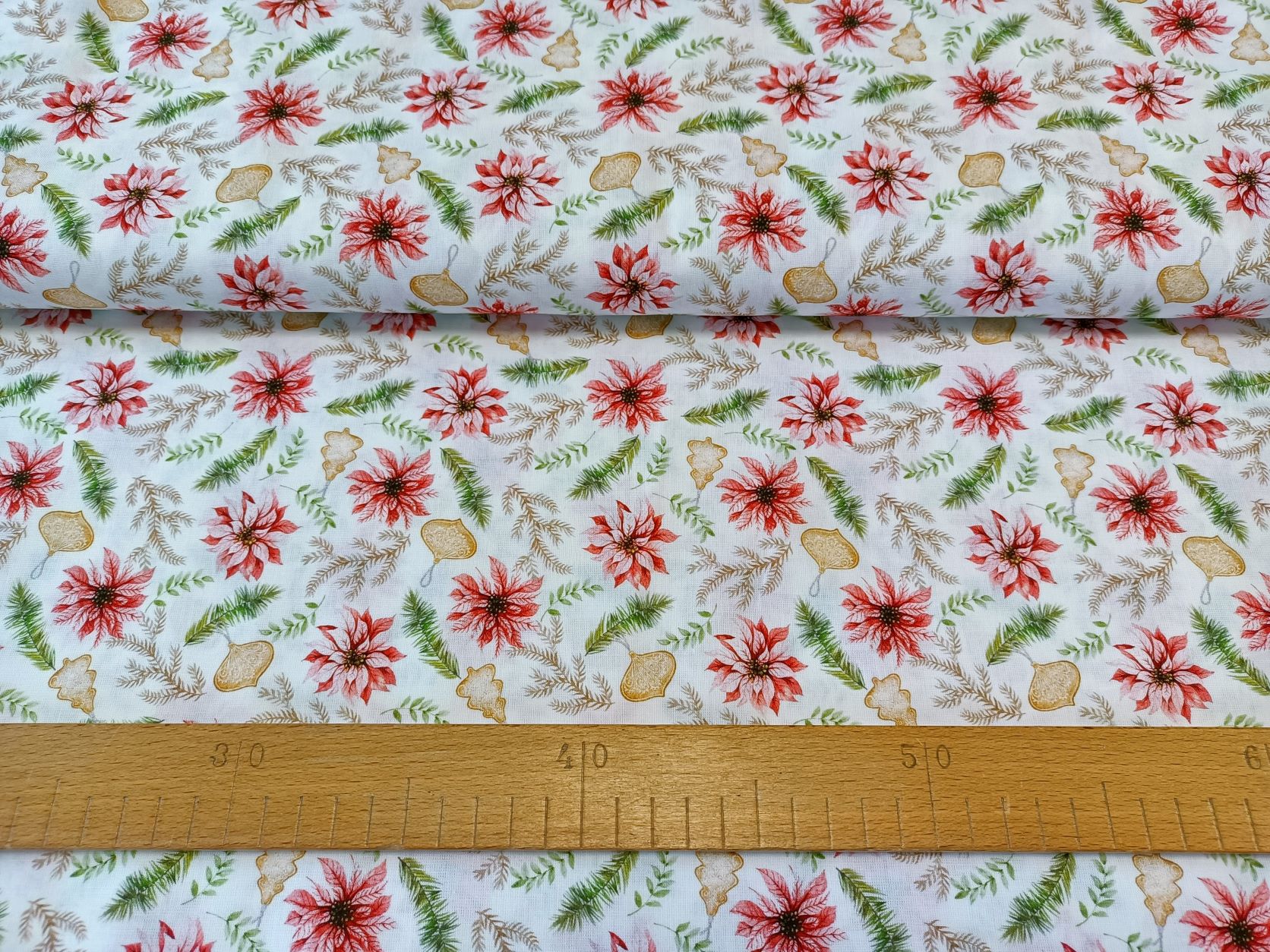 Jemná bavlněná látka gramáží 120 g/m2 a digitálním tiskem vánočních motivů má šíři 150 cm.